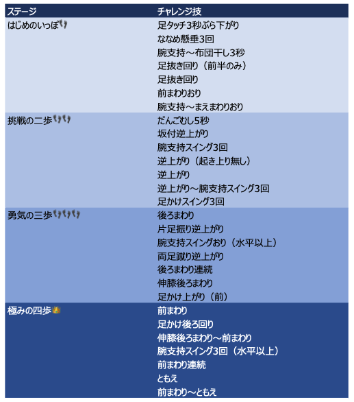 (例:はじめの一歩ステージにいる場合、鉄棒は「足抜き回り」をチャレンジする)
