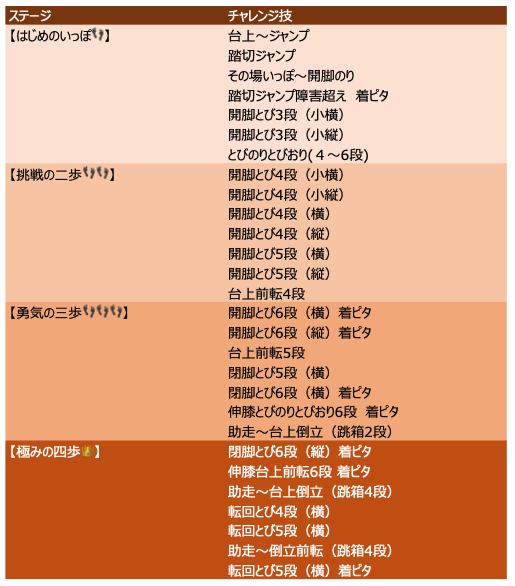 (例:鉄棒、跳箱、マット全てのはじめのいっぽステージの技をクリア)
