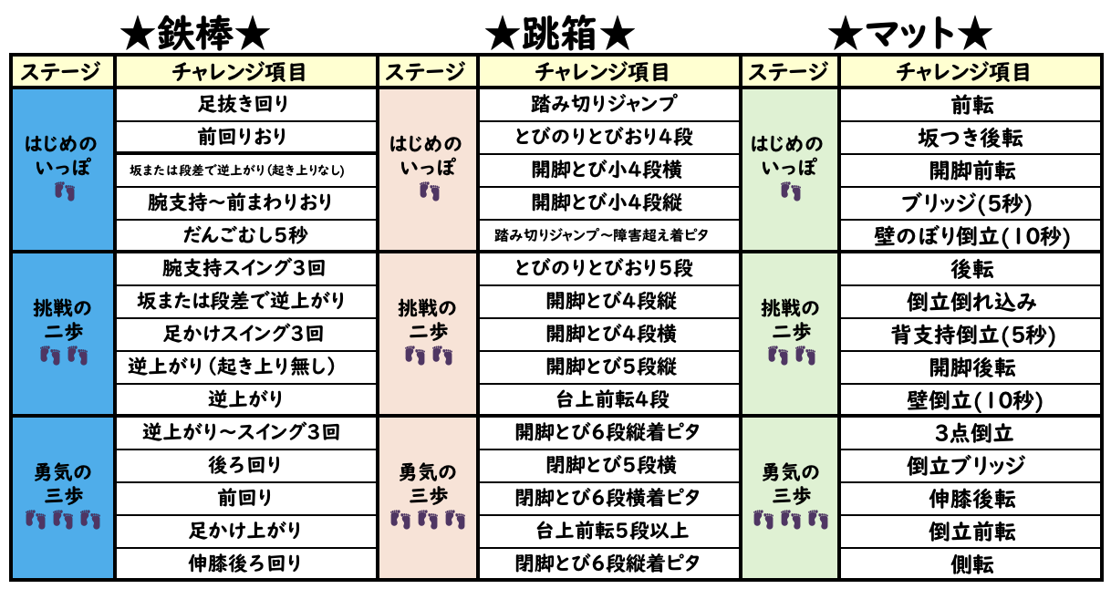 (例:鉄棒、跳箱、マット全てのはじめのいっぽステージの技をクリア)