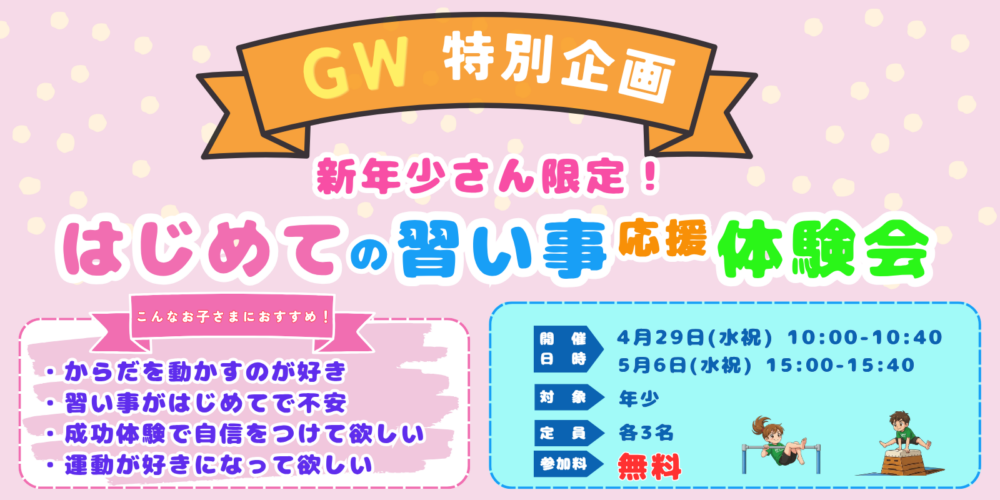 運動神経の伸びが著しい年代の為、鉄棒、跳箱、マット、縄跳びなどの種目に加えリズム体操など様々な体の動かし方を学ぶクラスです。またお子様、保護者様で目標の練習技を決めてチャレンジも行います。